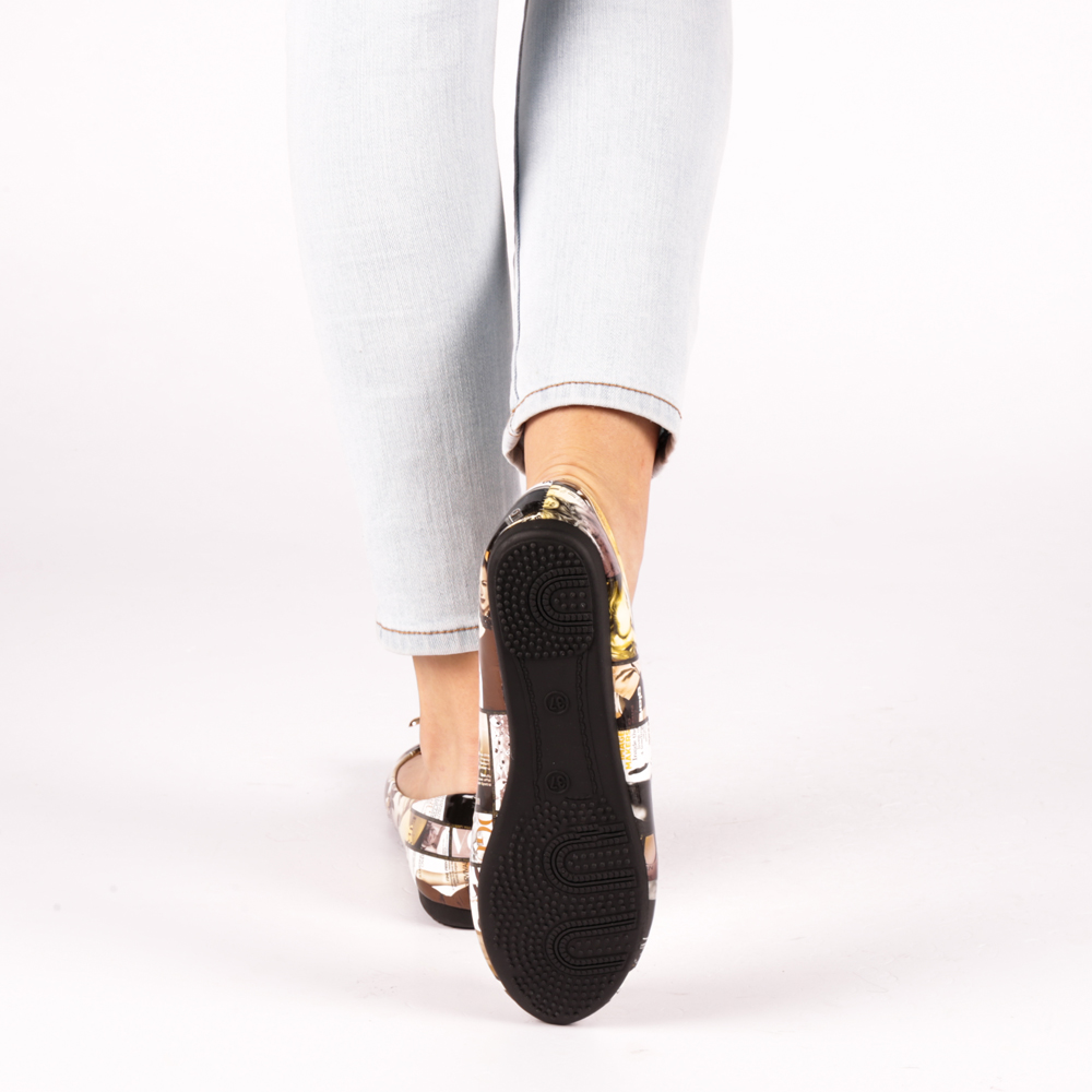 Jellemzőiműbőr női balerinakerek orrfényes kinézetdekoratív fém csattkényelmes talpbetét természetes bőrbőlcsúszásmentes talpÖsszetételKülső: műbőrBelső: műbőrTalp: szintetikus anyag