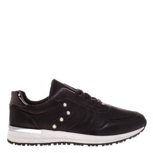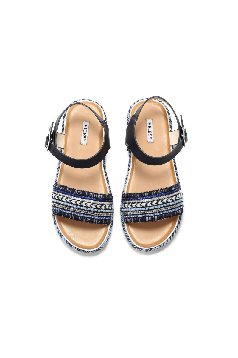 Lapos talpú szandál. Anyaga öko bőr és textil összekapcsolása. Gyöngyökkel, flitterekkel és fémes hatású díszelemekkel dekorált modell.